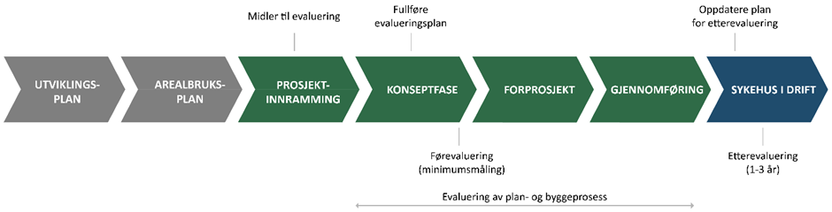 En overordnet evalueringsplan skal påbegynnes i prosjektinnrammingen og fullføres i konseptfasen. Planen for etterevaluering skal oppdateres når sykehuset har kommet i drift.